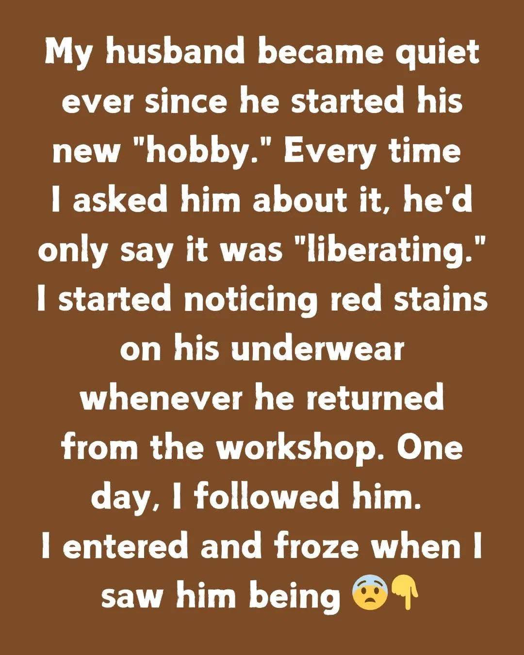 My husband became quiet ever since he started his new “hobby.” Every time I asked him about it, he’d only say it was “liberating.” I started noticing red stains on his underwear whenever he returned from the workshop. One day, I followed him.