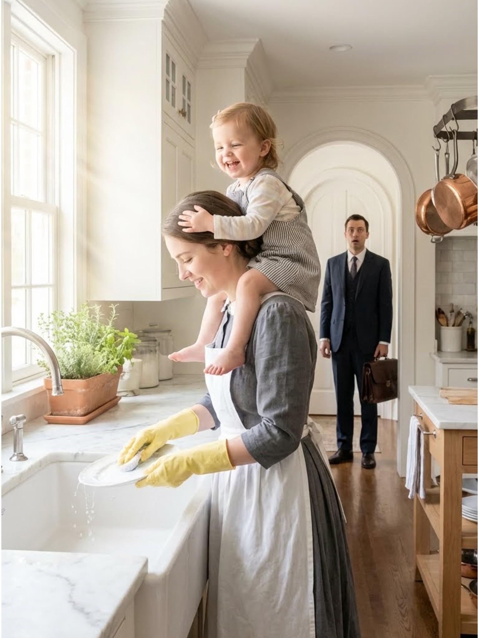 There was Ava. His silent, grief-buried daughter. Sitting on the maid’s shoulders, giggling as they washed dishes together. Not just smiling—laughing. A bright, musical laugh he had not heard since the night everything fell apart.