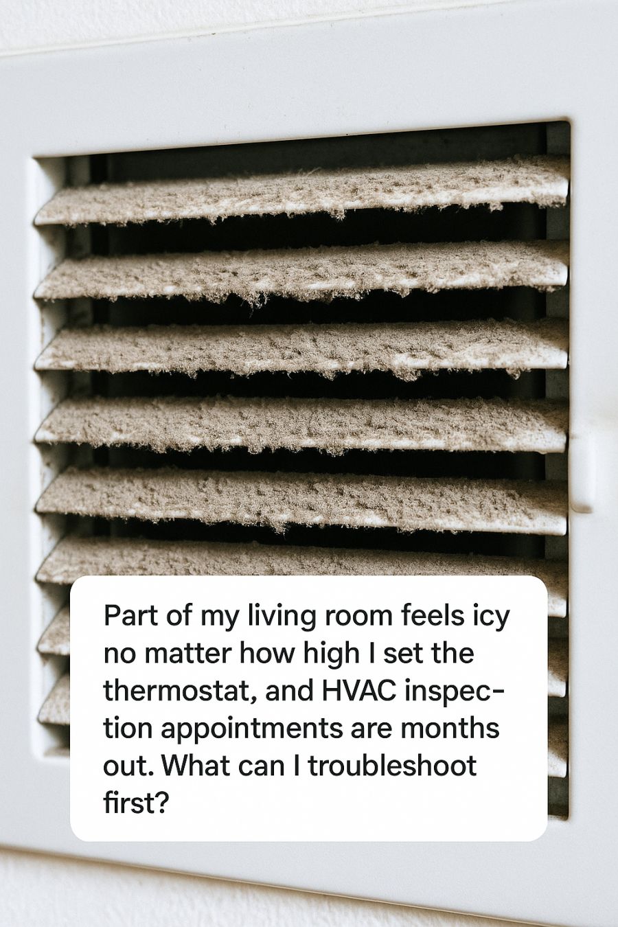 Part of my living room feels icy no matter how high I set the thermostat, and HVAC inspection appointments are months out. What can I troubleshoot first?