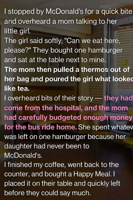 The story begins with the narrator stopping at McDonald’s after a long day, looking for a simple moment of rest. While waiting, they notice a mother and her young daughter entering the restaurant. The girl, around six or seven, has messy braids, worn shoes, and an excited expression as she studies the menu above the counter. Their clothing is clean but clearly old, hinting at financial hardship.